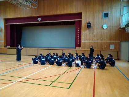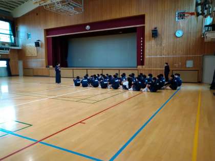 今日は、1年生の男子が対象でした。まずは、なぎなたをするにあたり、礼儀がとても大切であることを教えていただきました。どのスポーツにも通じる所がありますね。いい機会を与えていただき、ありがとうございました。