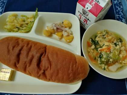 今日の給食は「中華おこわ、卵スープ、キャベツのオイスターソース炒め、コッペパン、バター、牛乳でした。