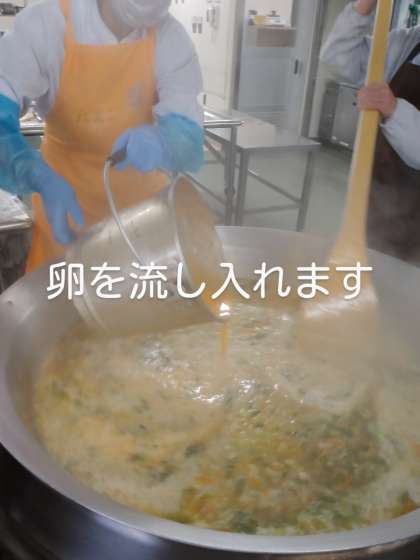 卵を扱う調理員は黄色のエプロンをつけ、他のものに触れないように注意しながら調理をすすめます。また、除去食担当は、卵スープを調理した調理員以外の者しかできません。出来上がった除去食は、生徒が個別に給食室に取りに来ます。ルールを守って、事故の無いようにすすめます。