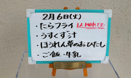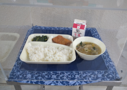 本日の給食のメニューは、たらフライ、うすくず汁、ほうれん草のおひたし、ごはん、牛乳でした。