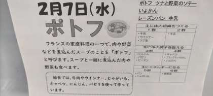 フランスの家庭料理の一つで、肉や野菜などを煮込んだスープのことを「ポトフ」と呼びます。スープと一緒に煮込んだ肉や野菜も食べます。給食では、牛肉やウインナー、じゃがいも、キャベツ、にんじん、パセリを使って作っています。