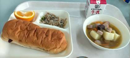 本日の給食のメニューは、ポトフ、ツナと野菜のソテー、いよかん、レーズンパン、牛乳でした。