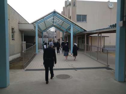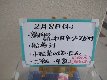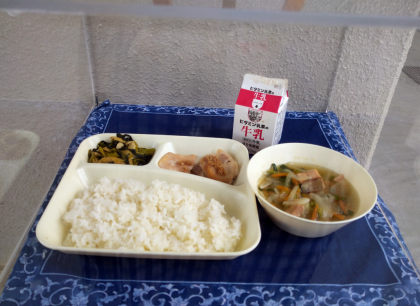 本日の給食のメニューは、鶏肉のなにわ甘辛ソースかけ、船場汁、小松菜の炊いたん、ごはん、牛乳でした。
