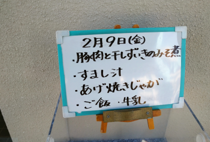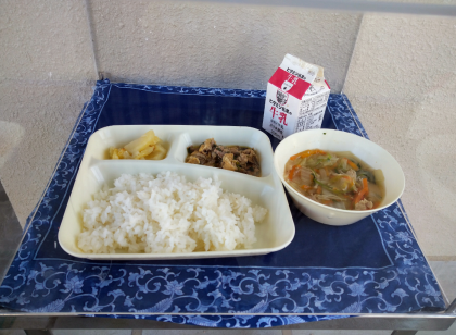 本日の給食のメニューは、豚肉と干しずいきのみそ煮、すまし汁、あげ焼きじゃが、ごはん、牛乳でした。