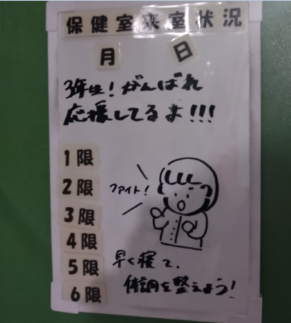 明日の3年生のみなさんの受験に向けて、保健室より力強いメッセージをいただきました!「3年生!がんばれ応援しているよ!!!ファイト