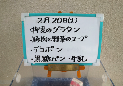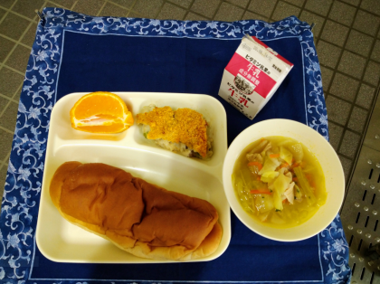 本日の給食のメニューは、押麦のグラタン、豚肉と野菜のスープ、デコポン、黒糖パン、牛乳でした。