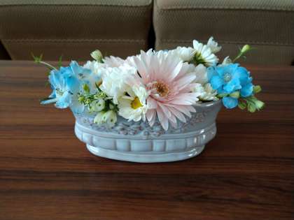 今週は、爽やかな色合いのお花を活けていただきました。今週もありがとうございます!