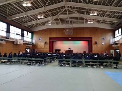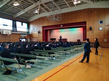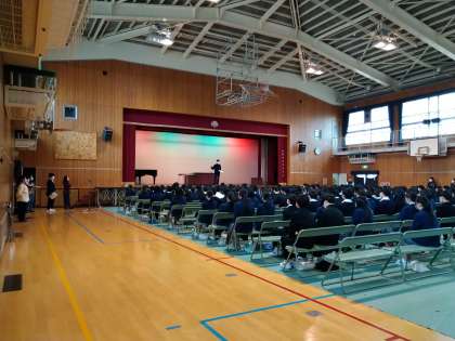 本日5・6限目、3年生の卒業式練習を行いました。まず、式練習の始めに、学年主任より卒業証書授与式に臨むにあたり、大切なお話がありました。卒業式は、自分自身のためだけではなく、ここまで育ててくれた親への感謝、この1年間しっかりと寄りそってくれた先生方への感謝、周りの仲間への感謝など、支えられた方々へ成長を見せる場であります。みんなで作り上げていくものです。一挙手一投足に誠心誠意、思いを込めて、式の練習に臨み、すばらしい卒業式になるよう、心を込めて行動をしましょう。
