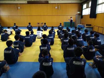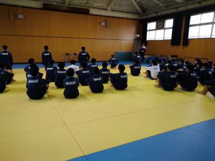 本日の5限目の授業の様子です。2年生の保健体育は「柔道」(上)の授業でした。礼儀を重んじながら、授業に取り組みました。和の心を大切にした授業でした。格技室の空気が、ピーンと張り詰めていました。