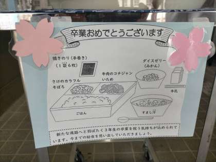 新たな進路へと羽ばたく3年生の卒業を祝う気持ちが込められています。今までの給食を思い出していただきましょう。