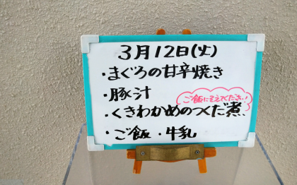 本日の給食のメニューは、まぐろの甘辛焼き、豚汁、くきわかめのつくだ煮、ごはん、牛乳でした。