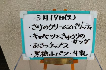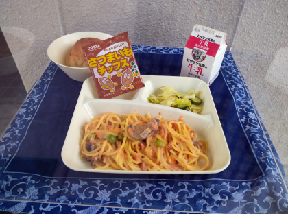 本日の給食のメニューは、さけのクリームスパゲッティ、キャベツときゅうりのサラダ、おさつチップス、黒糖パン1/2、牛乳でした。