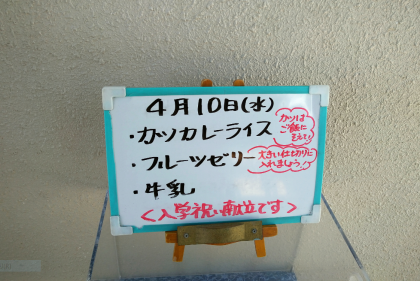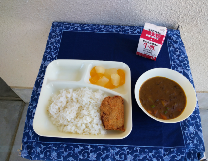 本日の給食のメニューは、≪入学祝い献立≫ カツカレーライス、フルーツぜり、牛乳でした。