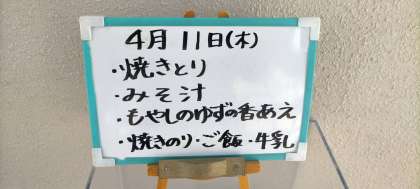 本日の給食のメニューは、やきとり、みそ汁、もやしのゆずの香あえ、焼きのり、ごはん、牛乳でした。