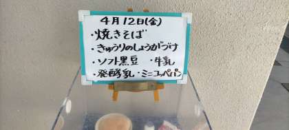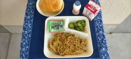 本日の給食のメニューは、焼きそば、きゅうりのしょうがづけ、ソフト黒豆、発酵乳、ミニコッペパン、牛乳でした。