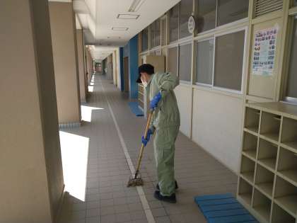 日々、管理作業員の方々が校内・校舎周辺をきれいに清掃をしてくださっています。ありがとうございます。5限目、廊下をきれいに拭いてくださっていました。