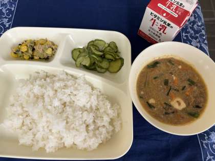 本日の給食のメニューは、マーボーどうふ、きゅうりの中華あえ、ツナとチンゲン菜のいためもの、ごはん、牛乳でした。
