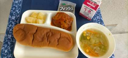 本日の給食のメニューは、煮込みハンバーグ、野菜スープ、ミニフィッシュ、洋なし(