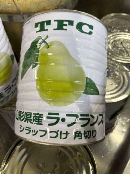 デザートは洋梨の缶詰です。山形県産のラ・フランスを使っています。香りが良いのが特徴ですね。