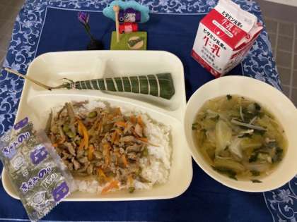 今日の献立は、きんぴらちらし、すまし汁、ちまき、牛乳です。皆さん、お味はいかがでしたか。