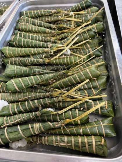 大阪市の学校給食の「ちまき」は、原材料はすべて国産で、市販されているものと比べて、糖分を控えた大阪市独自のものです。うるち米の粉などで作ったもちを新潟県産の笹の葉で包み、熟練の職人さんが、い草を1本づつ巻きあげて仕上げているそうです。子どもの成長を願い、子どもの日の行事献立として毎年登場しています。