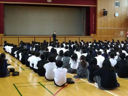 本日の水曜日は、定例の学年集会の日でした。先生のお話をしっかりと聞くことができていました。先生からは、自分の発言の中で、ネガティブな発言はありませんか?しんどいな…だけで終わっていませんか?でも、頑張ろう!という気持ちが大切ですね。マイナスの発言をしていると、マイナスの方向に進んでしまいます。でも、頑張ろうとする気持ち、姿勢がいい方向に導いてくれるものです。発言においては、友だちに対していい言葉かけができていますか?親しき中にも礼儀ありです。きちんとした言葉を交わしましょう。いい空間をみんなで作れるようにしたいものですね。