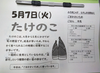 たけのこが、今日のメニューの「ごまかかいため」に使われています。