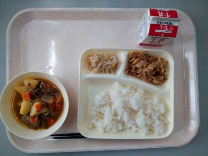 本日の給食のメニューは、みそ肉じゃが、もやしの甘酢あえ、ごまかかいため、ごはん、牛乳でした。