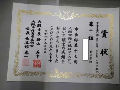市長杯第17回大阪市陸上フェスタ 男子共通800mで2位入賞しました!記録は、2分09秒03です。「おめでとうございます!」