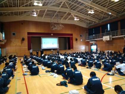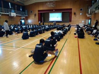 本日4限目、3年生は体育館に集合し、全体でしおりの読みまわせをしました。みんなしっかりと話を聞いていました。きちんと大切な箇所はチェックをし、確認をしました。