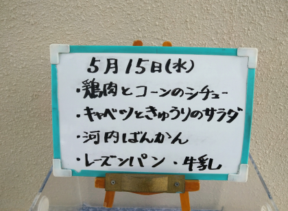 本日の給食のメニューは、鶏肉とコーンのシチュー、キャベツときゅうりのサラダ、河内ばんかん、レーズンパン、牛乳でした。