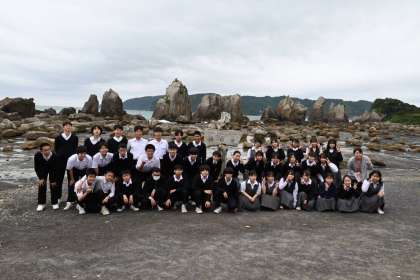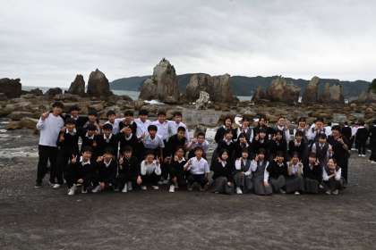 橋杭岩での学級写真撮影です。今回の修学旅行1発目の「学級写真」です。ホームページ用の写真なので、はっきりと顔は出ておりませんが、みんな、いい表情です。