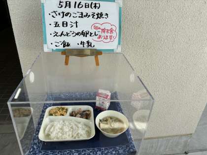 本日の給食のメニューは、さけのごまみそ焼き、五目汁、えんどうの卵とじ、ごはん、牛乳でした。