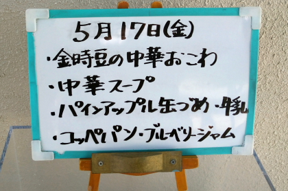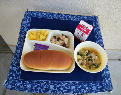 本日の給食のメニューは、金時豆の中華おこわ、中華スープ、パインアップル(カット缶)、コッペパン、ブルーベリージャム、牛乳でした。