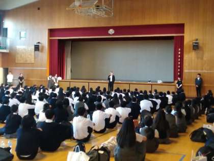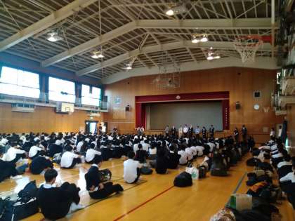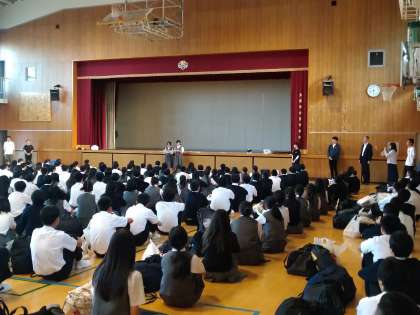 修学旅行最後の帰校式を行いました。生徒主体の司会進行のもと、帰校式が行われました。代表の生徒さんからは、この経験を活かしましょうとの力強い言葉があり、校長先生からも大きな事故がなく終えたことや、学年の先生からも76期生みなさんのパワーを感じたこと、この経験をこれからに活かそうとのお話がありました。お世話になった旅行会社の方、写真屋さんにきちんと感謝の気持ちも伝えることができました!写真を見て、この修学旅行を思い出して欲しいとのお話しや、今後の人生の大きな経験となることへの願いなど、多くの人からお褒めのことばをいただきました。成功を収めた修学旅行でした!