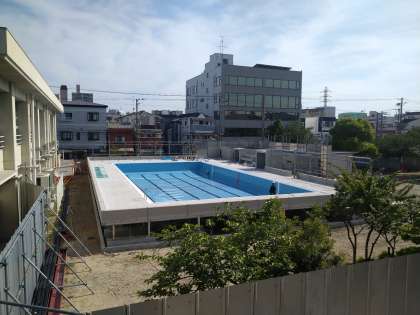プールの底面にラインが引かれました。完成まであと1か月半?早く完成してほしいものです。