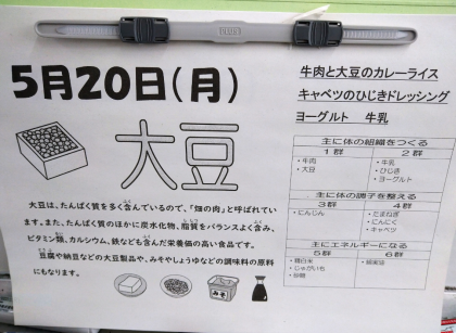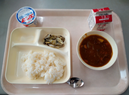 本日の給食のメニューは、、牛肉と大豆のカレーライス、キャベツのひじきドレッシング、ヨーグルト、牛乳でした。