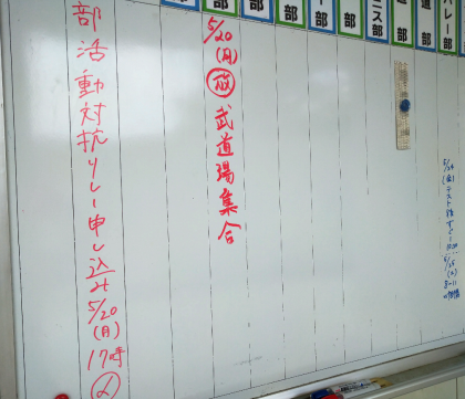 テスト1週間前となり、大会を控えていない部活動は、お休みです。部活動連絡ボードに「部活動対抗リレー」申し込み締め切りの文字がありました。コロナ禍を越え、部活度対抗リレーが復活です。とても楽しみですね!