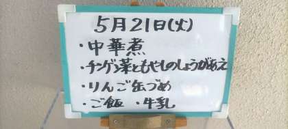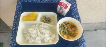 本日の給食のメニューは、中華煮、チンゲン菜ともやしのしょうがあえ、りんご(カット缶)、ごはん、牛乳でした。