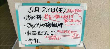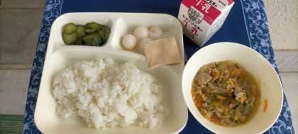 本日の給食のメニューは、豚丼、きゅうりの梅風味、白玉だんご、牛乳でした。