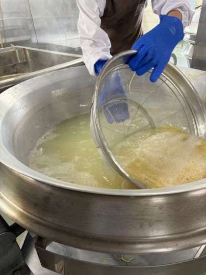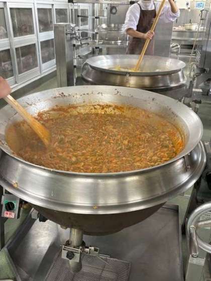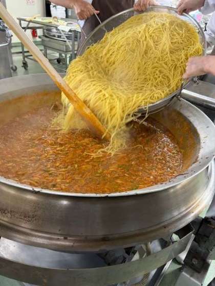 ミートソースの仕上がりと並行して、スパゲッティをゆでています。ゆであがったスパゲッティをルウに入れて仕上げますが、菫中学校の食数では、大量になるため、混ぜる作業も一苦労です。焦がさないよう火加減に気を付けて、常に鍋底を混ぜています。教室では欠席が多いクラスもあったようですが、給食室にはいくつもの空の食缶が返ってきていました。