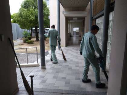 管理作業員のみなさん、今日の朝から清掃ありがとうございます。昨日の雨、風の影響でかなり落ち葉と廊下が濡れていましたが、みなさんの登校前に、きれいに清掃をしていただきました。ありがとうございます。