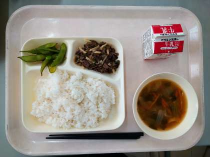 今日の給食は、チンジャオニューロウスー、中華みそスープ、枝豆、ごはん、牛乳でした。