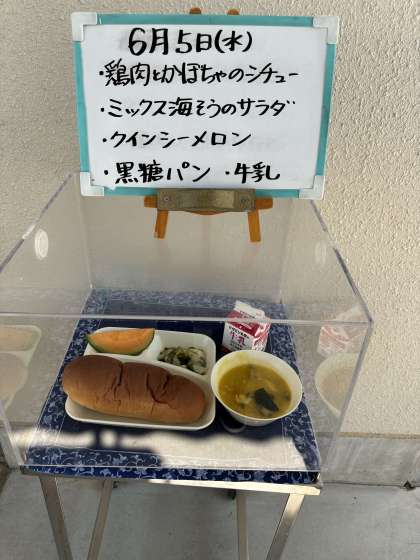 今日の給食は、鶏肉とかぼちゃのシチュー、ミックス海そうのサラダ、クインシーメロン、黒糖パン、牛乳でした。