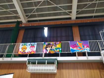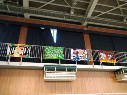 本日、学級旗コンテストが行われました。どの学級が表彰されるのでしょうか?順位は付きますが、どの学級も素晴らしい作品です。わがクラスがNo.1と自信を持ってください!、デザイン、色塗りを含め、携わってくださったみなさん「ありがとうございます。」
