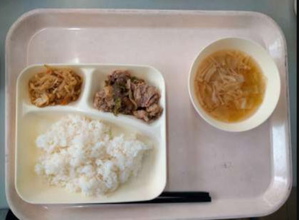 今日の給食のメニューは、豚肉のごまみそ焼き、すまし汁、切り干し大根のいため煮、ごはん、牛乳でした。