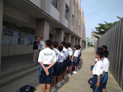 水泳部のミーティングの様子です。水泳部は近隣の学校に練習に行っております。プール工事のため、不便な思いをさせています。ごめんなさい。