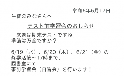 *日時:6/19(水)、6/20(木)、6/21(金) 終学活後〜17時まで