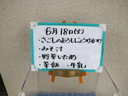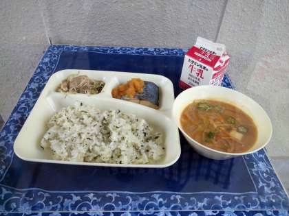 本日の給食のメニューは、さごしのおろしじょうゆかけ、みそ汁、野菜いため、菜飯、牛乳でした。