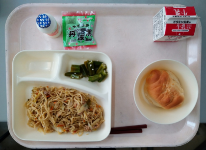 本日の給食のメニューは、和風焼きそば、オクラの甘酢あえ、ソフト黒豆、発酵乳、ミニコッペパン、牛乳でした。